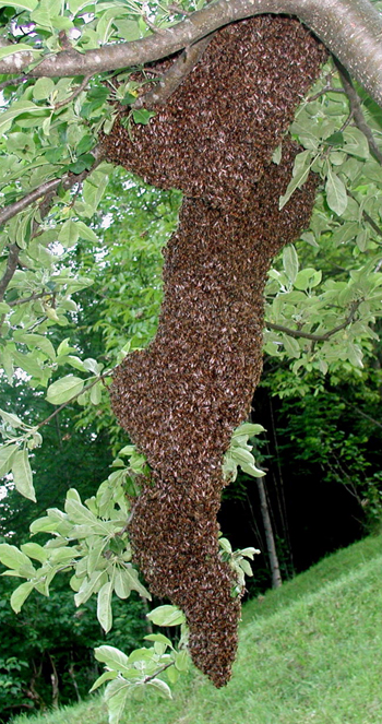 Wird das Bienenvolk zu stark oder sind die Jungbienen unterbeschäftigt, entsteht Schwarmtrieb. Es kommt zur natürlichen Vermehrung, wobei der Imker meist Jungvölker bildet und Schwärme verhindert. |